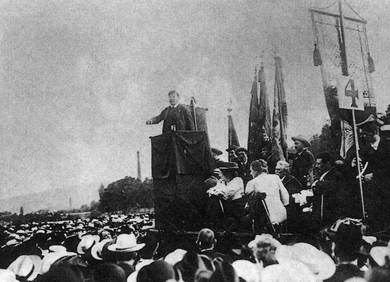 HRH on the podium at the Stuttgart meeting, 1907, seated on the right. Rosa Luxemburg is on her left, Bebel is speaking