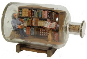 (from the catalogue:) 55/ 81  [Objects for booklovers]. (Bearded man in his study). Scale model of a private library w. 2 bookcases, comprising 9 shelves w. ±100 imitation miniature books, mixed materials, in a glass bottle (Ş13,5, length 25 cm.)., 20th cent.